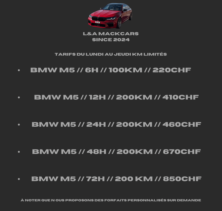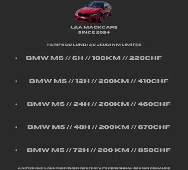 Découvrez ci-dessus notre tableau des tarifs pour la location de la BMW M5 F90 Compétition. Différents prix sur demande !