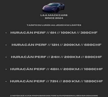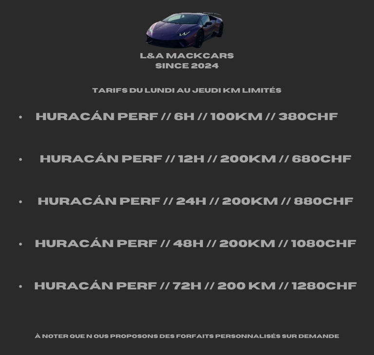 Découvrez ci-dessus notre tableau des tarifs pour la location de la Lamborghini Huracán Performante. Différents prix sur demande !