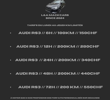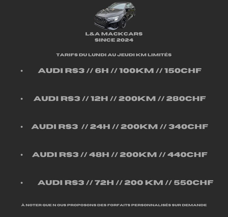 Découvrez ci-dessus notre tableau des tarifs pour la location de l'Audi RS3 Sportback. Différents prix sur demande !