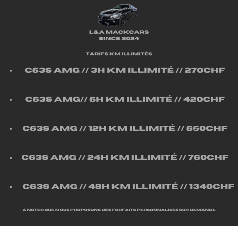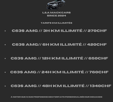Découvrez ci-dessus notre tableau des tarifs pour la location de la Mercedes-Benz C63S AMG. Différents prix sur demande !