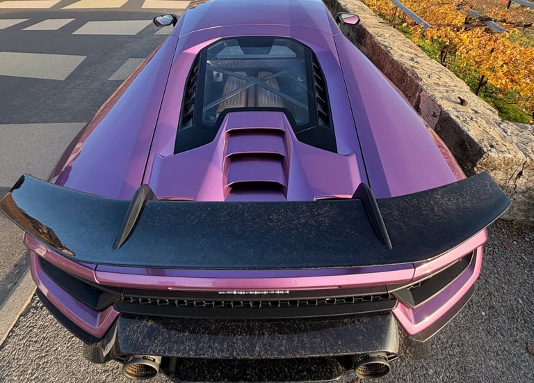 Avec sa peinture violette éclatante, ses appendices aérodynamiques, son énorme aileron et ses nombreuses pièces en carbone forgé, cette Performante attire tous les regards. Chaque détail respire l’exclusivité. Diffuseur, jupes, prises d’air, spoiler… rien n’a été laissé au hasard.